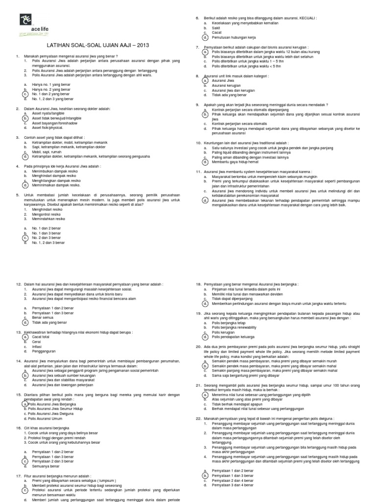 Latihan soal ujian lisensi asuransi jiwa dari AAJI berjumlah 100 soal berikut pembahasan dg merujuk pada materi pembelajaran asuransi jiwa100 soal dalam kum. Kumpulan Soal-Soal Asuransi Jiwa 1. Polis asuransi jiwa adalah perjanjian antara penanggung dengan tertanggung.