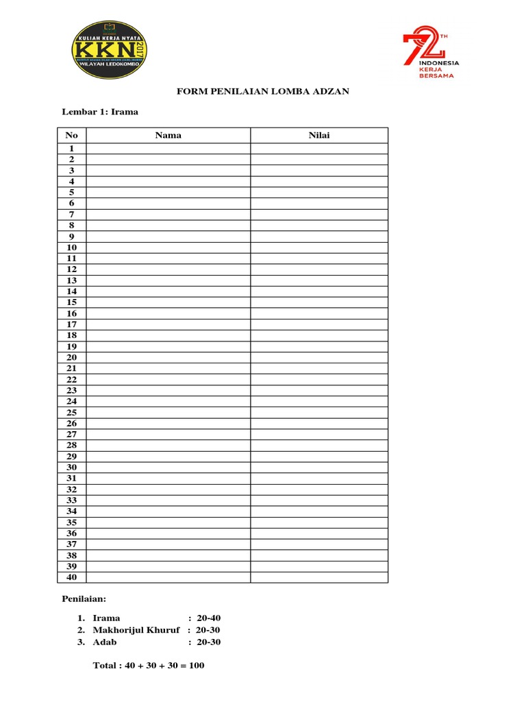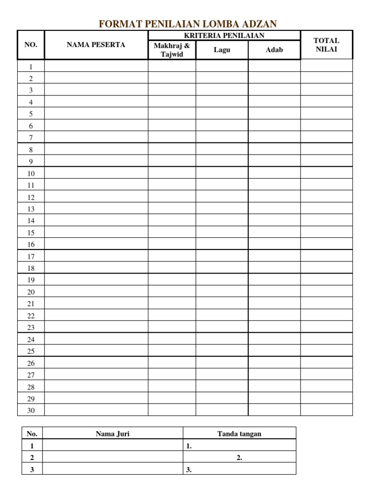 Download blangko form penilaian lomba adzan dan iqomah dalam bentuk format doc. Kriteria penilaian Jumlah No Nama Santri Kelas Makhraj Tajwid Lagu Adab 100 Ket 45 40 15 Makassar. Lomba TARTIL AL QURAN untuk Anak TPQ 23012019.