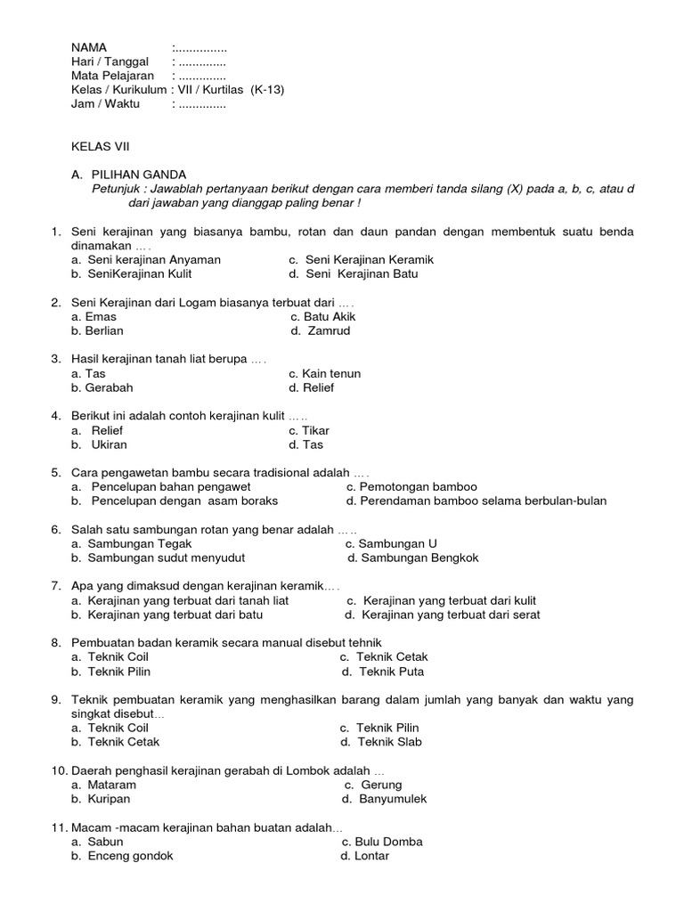 Soal Latihan Prakarya Aspek Kerajinan Worksheet