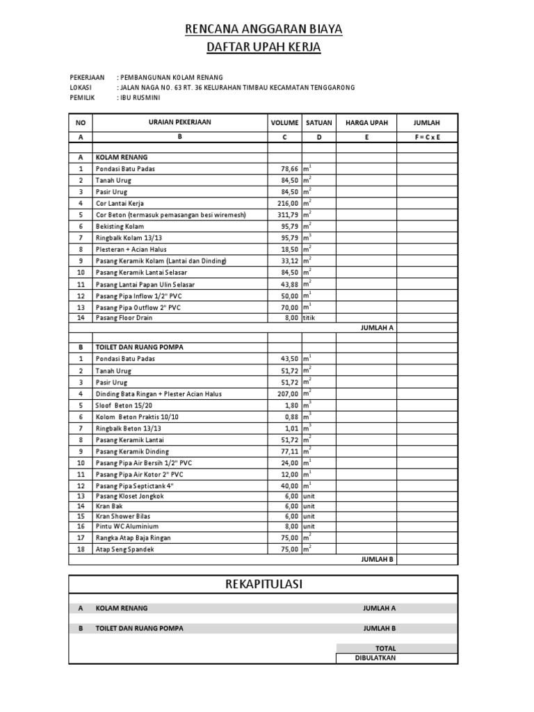 46 rows Rab Kolam Renang Excel Ukuran 36 x 76 x 15 Sistem Overflow Deal proyek kolam. Akan ada biaya tersendiri untuk arsitek kolam renang dan juga untuk tema waterboom yang anda inginkan itu. Rp 2000000- sd 2300000- m2.