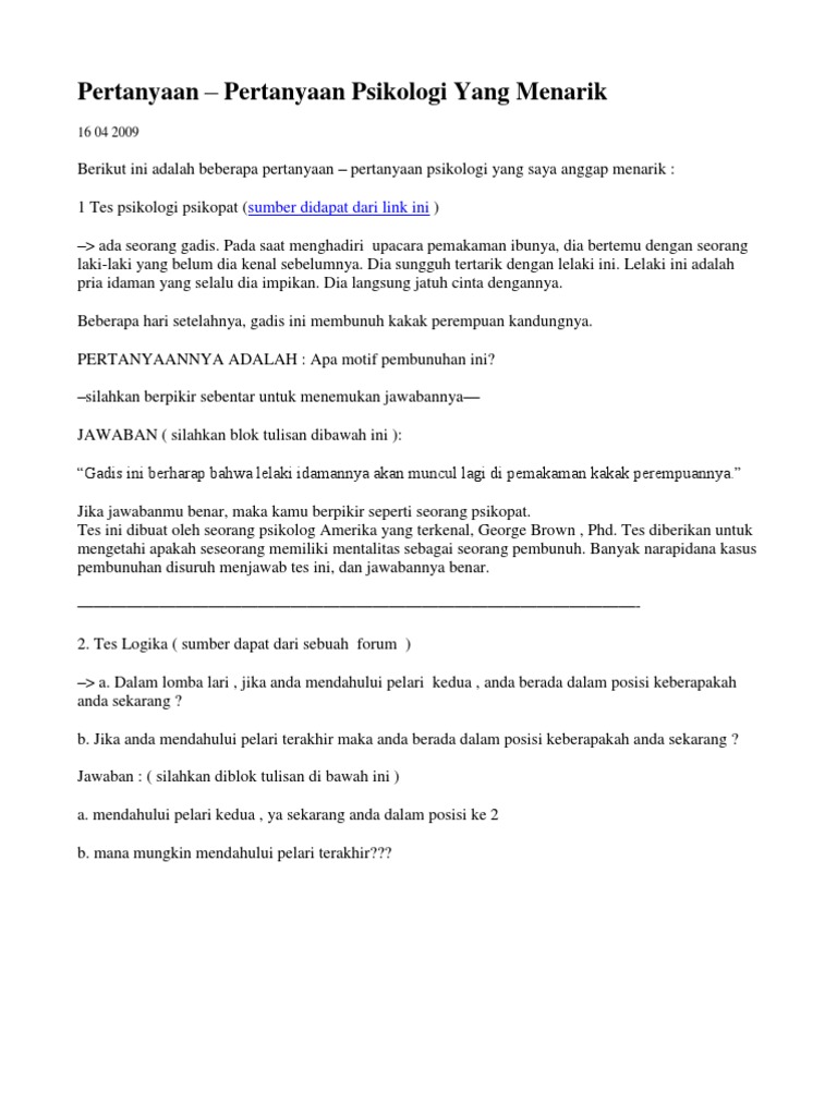 Pertanyaan psikologi cinta dan jawabannya. Tes Psikologi Cinta 1 Kamu sudah sampai di rumahnya siapa yang pertama kali muncul dan menyambutmu. Pada tahun 1879 psikologi diakui sebagai ilmu yang mempelajari tentang kejiwaan yang di lakukan oleh Wilhelm Wundt. Untuk setiap pertanyaan pilihlah satu jawaban yang paling mencerminkan dirimu.